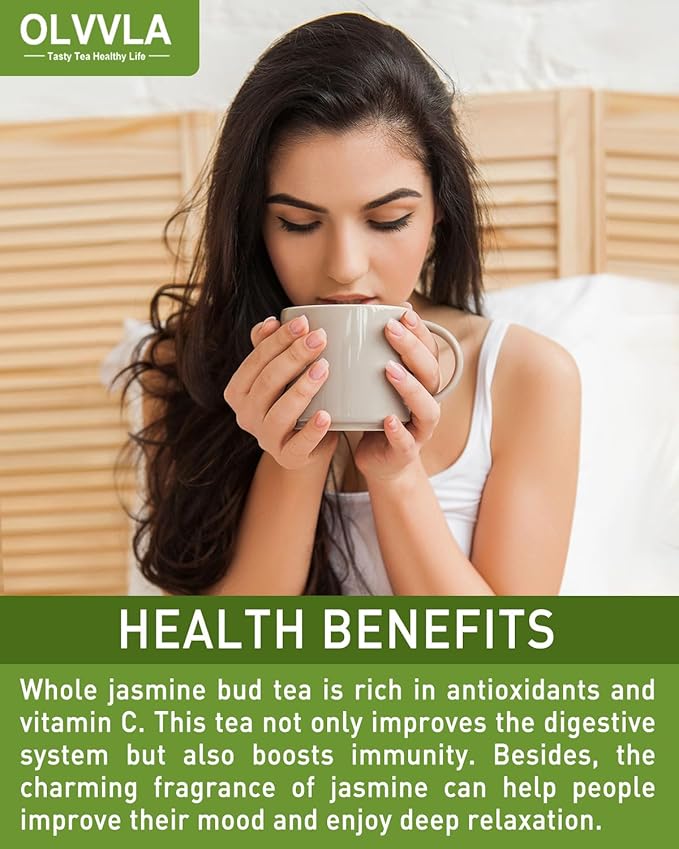 - HEALTH BENEFITS: Whole jasmine bud tea is rich in antioxidants and vitamin C. This tea not only improves the digestive system but also boosts immunity. Besides, the charming fragrance of jasmine can help people improve their mood and enjoy deep relaxation;