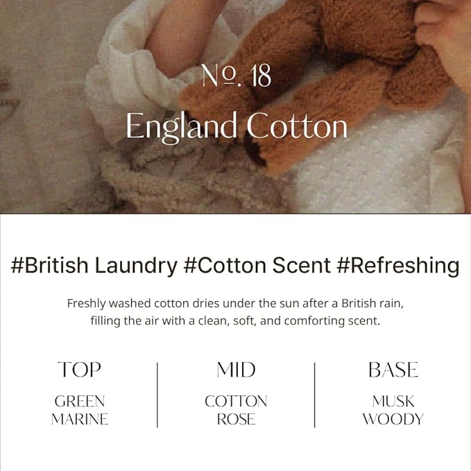 - ENGLAND COTTON SCENT: Experience the freshness of English Cotton after a rain shower. This scent recreates the coziness of freshly washed fabrics drying in the sunshine, infused with the clean, tender aroma of British cotton.