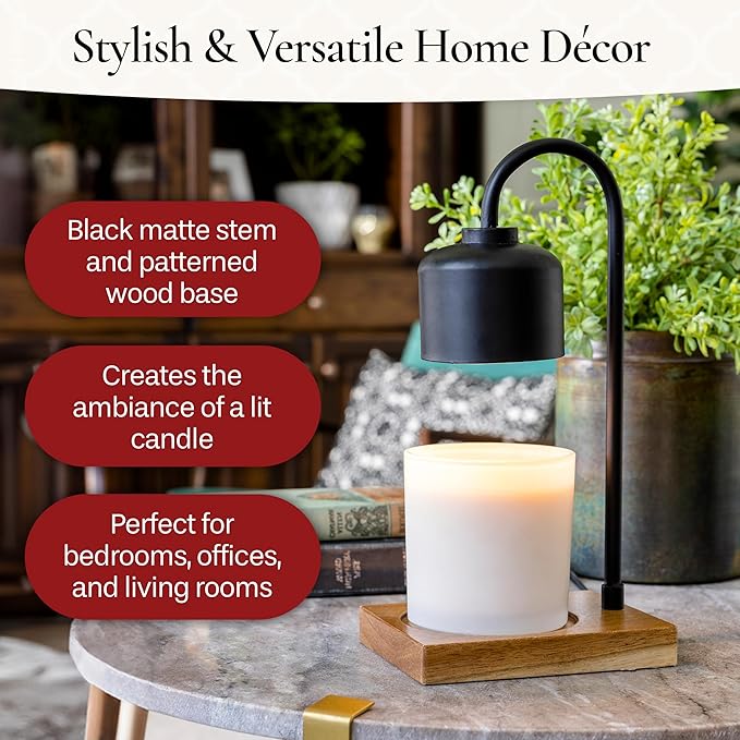 - STYLISH & VERSATILE HOME DECOR – The Black and Wood Arched Candle Warmer Lamp brings the warmth and beauty of a candle safely into your home. Featuring an elegant design of the black matte stem and rich patterned wood base, this warmer is perfect for any room.
