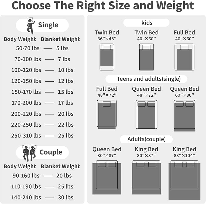 - HOW TO CHOOSE SIZE - We recommend that you choose a weighted blanket that weigh 7% to 12% of your body weight.Weighted blanket 15-20 lbs is intended for individuals weighing about 150-200 lbs. If you are using a weighted blanket for the first time, we recommend that you choose a lighter weight.In order to concentrate gravity on the body, it is generally a little smaller than the corresponding size