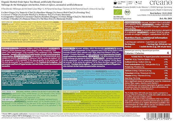 - Creano Organic Herbal Fruit Spice Tea Mix Gift Set "Organic Herbal Tea" is a unique blend of the different organic tea varieties: Fruity Chamomile, Hot Ginger, Turmeric Chai, Rooibos Mango, Sweet Red Chai, Evening Tea, Sweet Mint, Gentle Mood and Wellness Tea; 100% Organic, 9 x 5 Tea Bags
