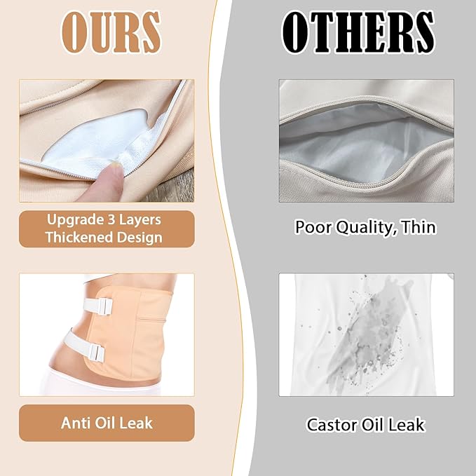 - 【Why Choose Us】The castor oil pack is made of organic cotton to help absorb all the oils and improve utilization. Three-layer thickened design and the inner layer is added with a waterproof coating, which can prevent oil leakage. The flannel cloth is soft and comfortable, which help fully absorb the castor oil and better utilize it. Velcro design makes it closer to your body and won't slide. Velcro at the neck helps you wear it better and prevent castor oil from getting on your face and hair
