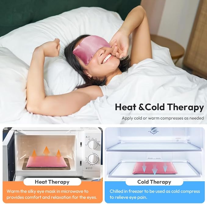 - 【Hot & Cold Therapy】:If you are suffering dry eyes, please try the Hot Therapy: just microwave the inner pad at mid-high Level for 30s under 90°C(Please do not overheat). If you are troubled by puffy eyes, you can try the Cold Therapy: just put the inner pad in the refrigerator for 1 hour. Then insert the cold pad into the silk eye cover. And then enjoy your eye spa.