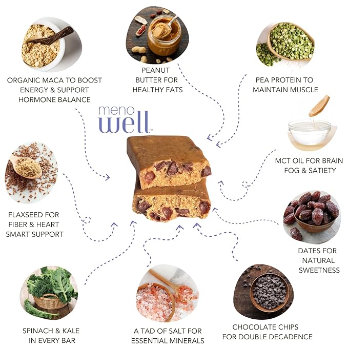 - MenoWell Menopause Transition Trifecta - Armed with organic maca to help balance blood sugar and support hormones, probiotic fiber to feel full & satisfied, and 7-8 grams of plant protein to maintain muscle and boost metabolism. We’ve also included MCT oil from coconuts to boost brain function, dates for sweetness, flaxseed, spinach, and kale in every bar.