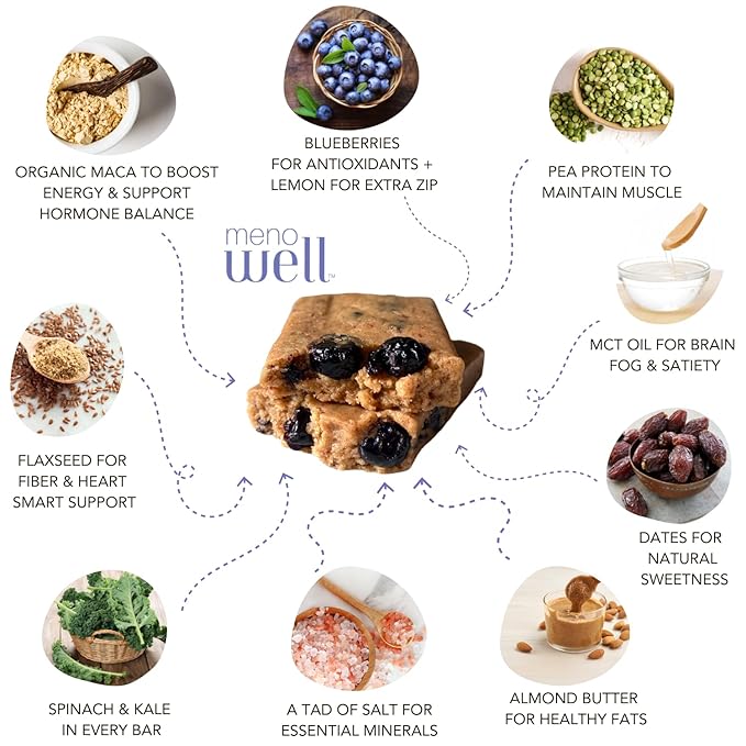 - MenoWell Menopause Transition Trifecta - Armed with organic maca to help balance blood sugar and support hormones, probiotic fiber to feel full & satisfied, and 7-8 grams of plant protein to maintain muscle and boost metabolism. We’ve also included MCT oil from coconuts to boost brain function, dates for sweetness, flaxseed, spinach, and kale in every bar.
