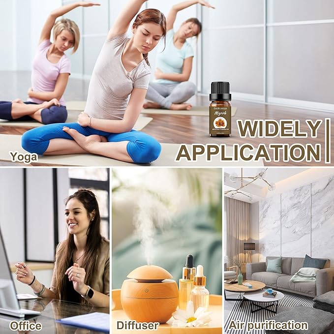 - Pure Myrrh Oil: Myrrh essential oil is extracted by steam distillation from the resin flowing from the branches of the shrubs. It has the unique strong smoke and bitterness of the gum, a dry and aromatic blend, and the smell is like musk, which makes you feel warm and pleasant.
