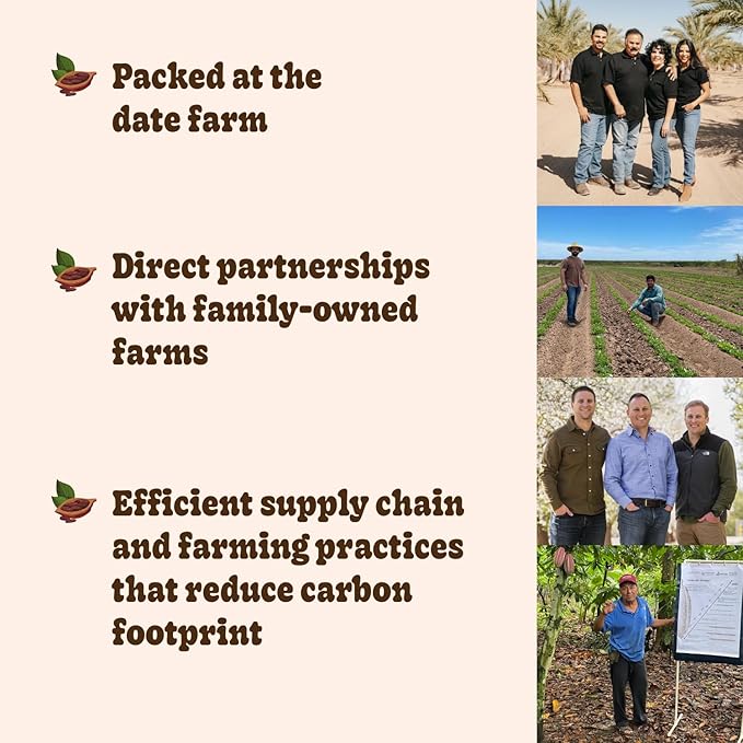 - FARM TO TABLE: Our organic Medjool dates are grown, harvested, pitted, and filled with natural peanut butter and cacao from our sustainable family-owned date farm partner.