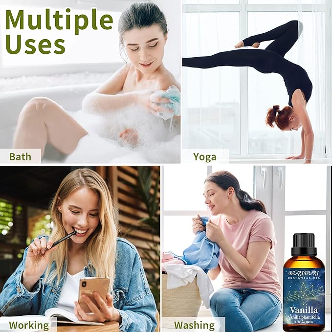 - Packing Includes: 100ml Vanilla Essential Oil x1, 100ml Coconut Essential Oil x1. BURIBURI scented oil is bottled in a durable amber glass bottle.