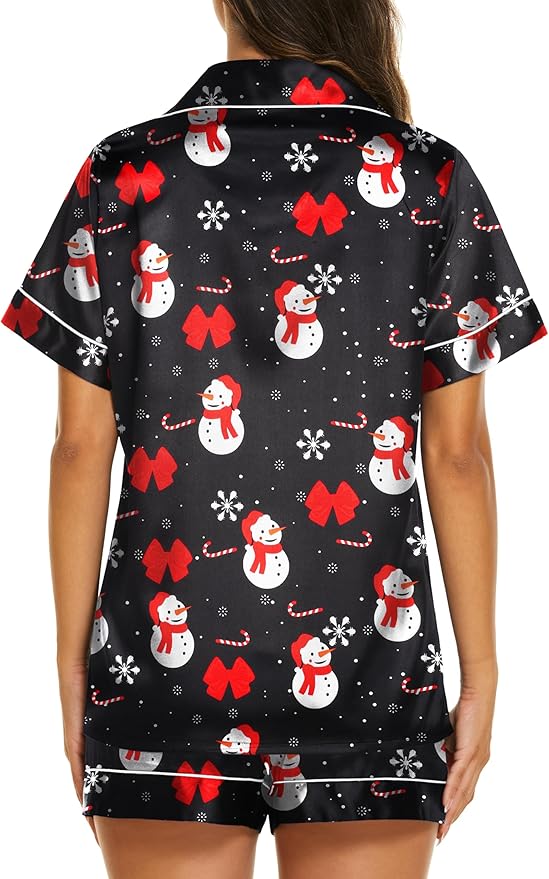 • Elegant design:Short sleeve pajama tops, button down front,notch lapel collar and one chest pocket.Matching pajama shorts for women with stretchy elastic waist that fits for any body size.Lightweight and Breathable,perfect for sleeping, lounging, or morning coffee in effortless grace