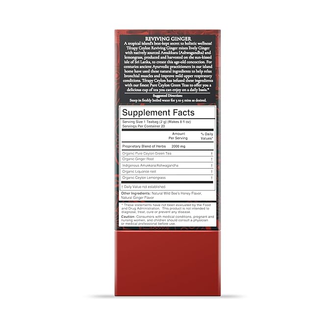 - ๐๐๐% ๐๐ซ๐ ๐๐ง๐ข๐ ๐๐ข๐ง๐ ๐๐ซ ๐๐๐ ๐๐๐ ๐ฌ - TERAPY AYURVEDIC Pure Honey Ginger Tea by Tรฉrapy Ceylon exclusively contains premium organic ingredients cultivated on our own estates to craft a healthy and flavorful brew. Our 20 individually wrapped organic ginger tea bags ensuring the highest quality standards.