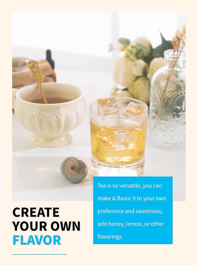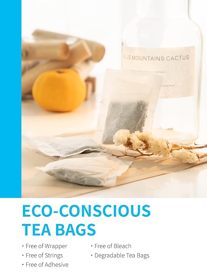 - [100 COUNT ECO-CONSCIOUS TEA BAGS] - Our premium tea bags are made from biodegradable non-GMO plant fiber. Packaged in a high-quality resealable foil-lined kraft pouch to keep tea fresh. No string and no tag. No extra waste - just healthy & delicious tea!