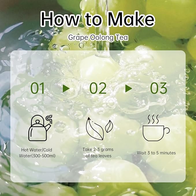 - Carefully Blended Ingredients – A harmonious mix of oolong tea leaves, natural green grape flavor, and real grape fruit pieces, crafted to deliver a balanced and refreshing taste.