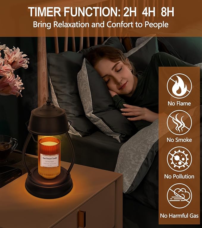 - 【Safe Candle Warmer Lamp With Timer】Our candle light warmer provide 3 timing duration options(2H/4H/8H) to create a comfortable atmosphere for you to sleep, do yoga and read books on a quiet night. You don’t have to worry about soot and flame. Safer to use, avoid accidental injury to pets or babies. No need to fear of pets knocking it over, without the risk of leaving them lit when leaving the room.