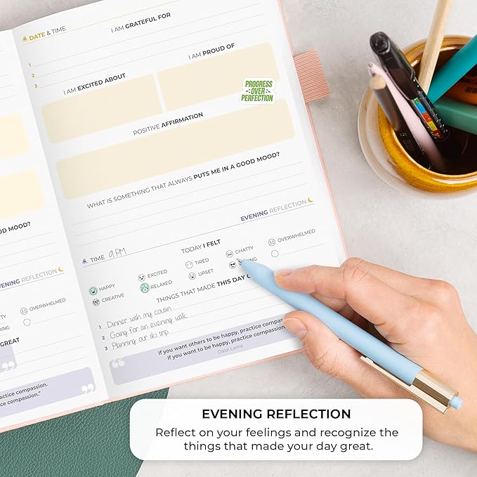 - YOUR DAILY DOSE OF POSITIVE THINKING – This daily journal with prompts requires just 4 minutes a day and helps you focus on the good, practice gratitude and affirmations, and be mindful of your feelings and emotions.