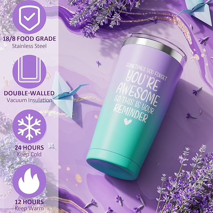 - INSULATED VACUUM TUMBLER: Made of 18/8 food-grade sturdy stainless steel, with double-walled vacuum insulation, this sweat-free insulated tumbler with lid can preserve beverage temperature up to 24h for cold & 12h for hot, great for iced coffee, tea, wine, juice, champagne, smoothies, sodas, milkshake, etc; "SOMETIMES YOU FORGET YOU'RE AWESOME...", encouraging quote printing boosts her confidence and brighten her days, making it an ideal relaxing gifts for her friendship gifts for women