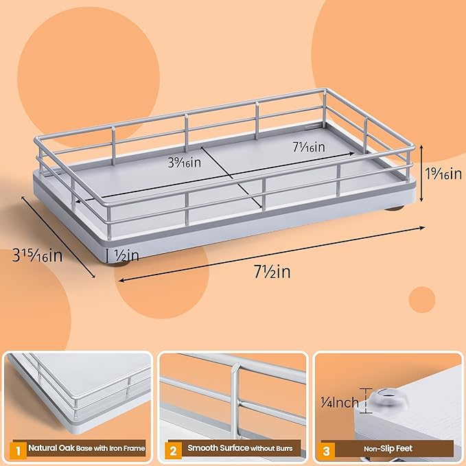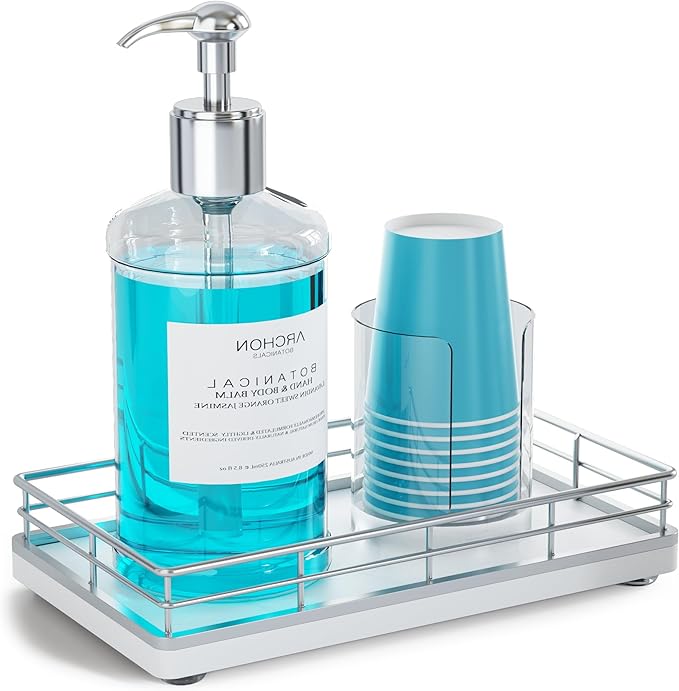 - Versatile Functionality: Elevate your daily routine with our tray for bathroom counter; Neatly arrange bathroom essentials like mouthwash with cups, toothbrushes, cotton swab, keeping your countertop tidy; Add a touch of elegance to your dresser by using the vanity tray to showcase perfumes, jewelry, and candles; The small tray can also be used to store keys, watches and change at the entrance