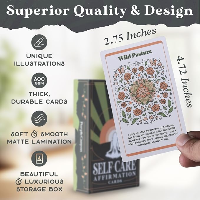 - A THOUGHTFUL GIFT: Show your friends how much you care about them by giving a beautifully designed affirmation deck. These self care cards are not only informative, but they also deepen your connections with your loved ones and make you a guiding light of positivity in the lives of others