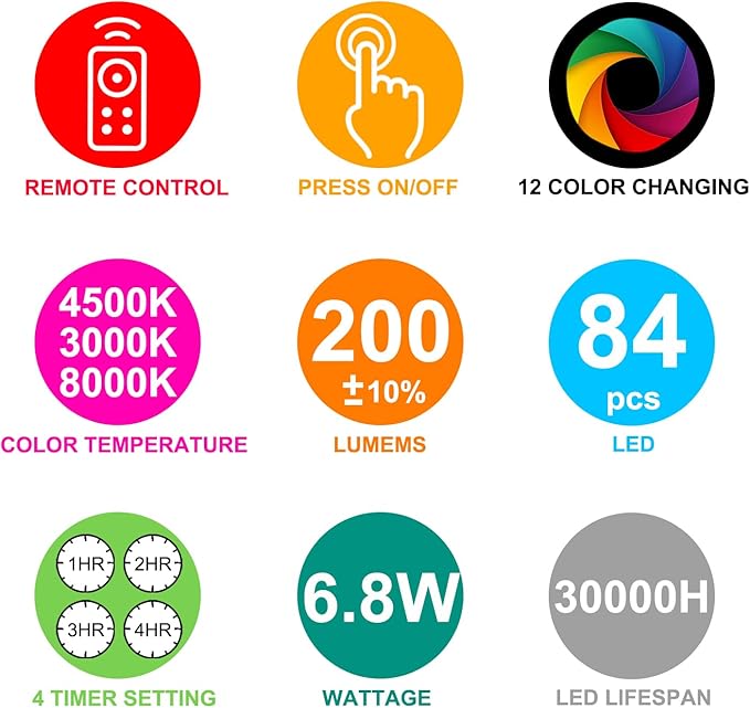 - 【Customizable Lighting Experience】: Set your desired time and choose from 9 colors changing LED light show, Cloudy Daylight (8000K), Neutral White (4300K), and 3000K warm light, providing tailored lighting for any situation.