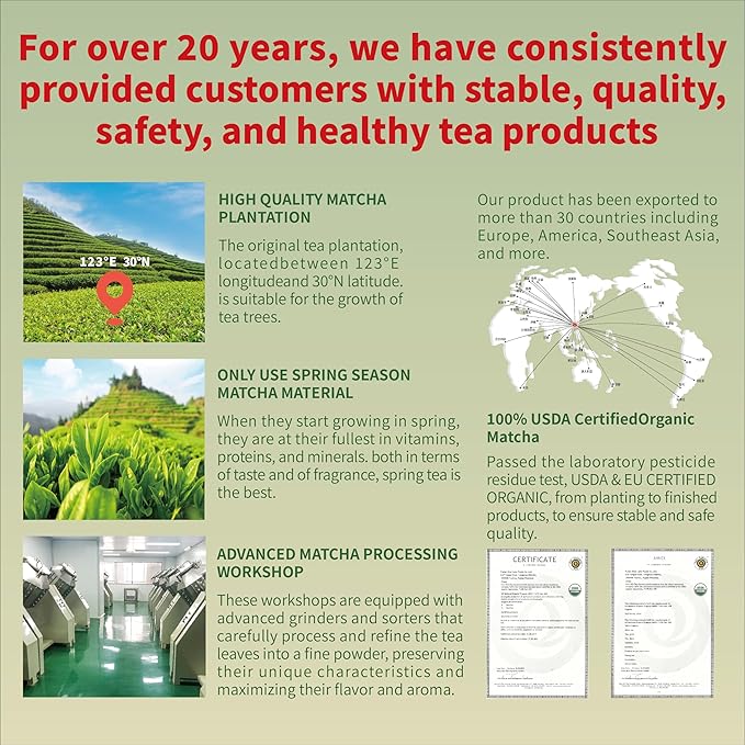 - Direct supply from the source : As factory sellers with our own tea gardens and factories more than 20 years, we have full control over the entire production process, allowing us to provide cost-effective and high-quality matcha powder