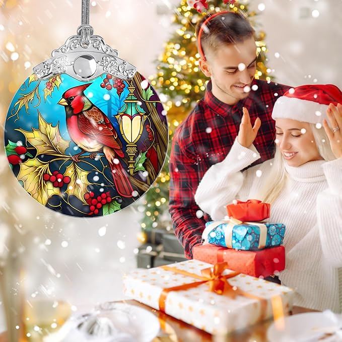 Christmas Ornament - Red Bird Cardinal Stained Glass Decor - Holiday Decorations and Xmas Gift Ideas for Tree
