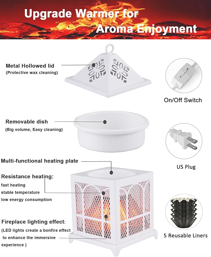 - ✅【Unique Design】This metal wax warmer is PCBA+LED, consisting of a metal frame and a window pattern, and the wax tray is made of Teflon technology, which is resistant to high temperatures and corrosion,The color and ambience of a realistic charcoal fireplace sets your room apart