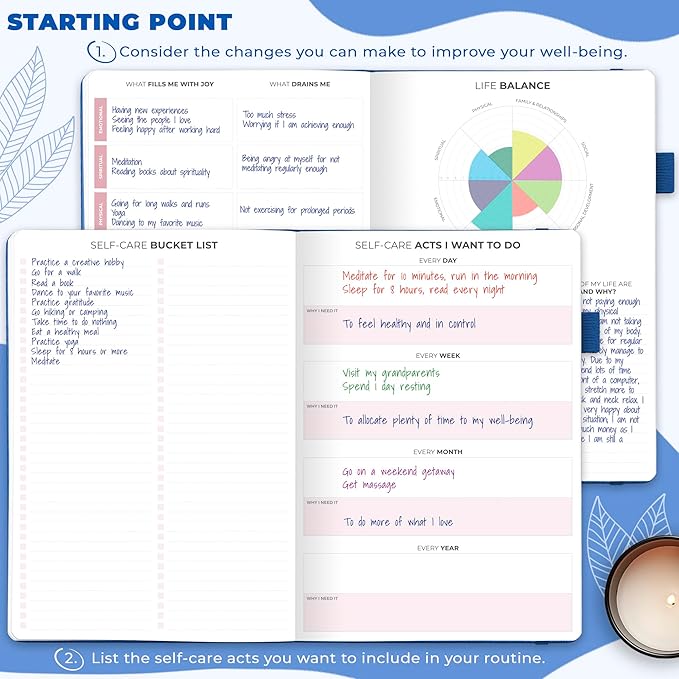 - BUILD A HAPPIER & HEALTHIER MINDSET FOR YEARS TO COME: This self care notebook is filled with prompts, open-ended questions, wellness trackers, and many other tools to help you pinpoint the changes you can make to improve your well-being.