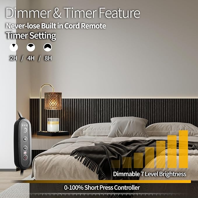 - DIMMER 7-LEVEL LUMINOSITY: Our candle melting lamp can be dimmer 7 level of light from 0-100 by switch, adjust the temperature for melting the candle. The higher brighther the faster melting speed, scented the fastest and strongest fragrance