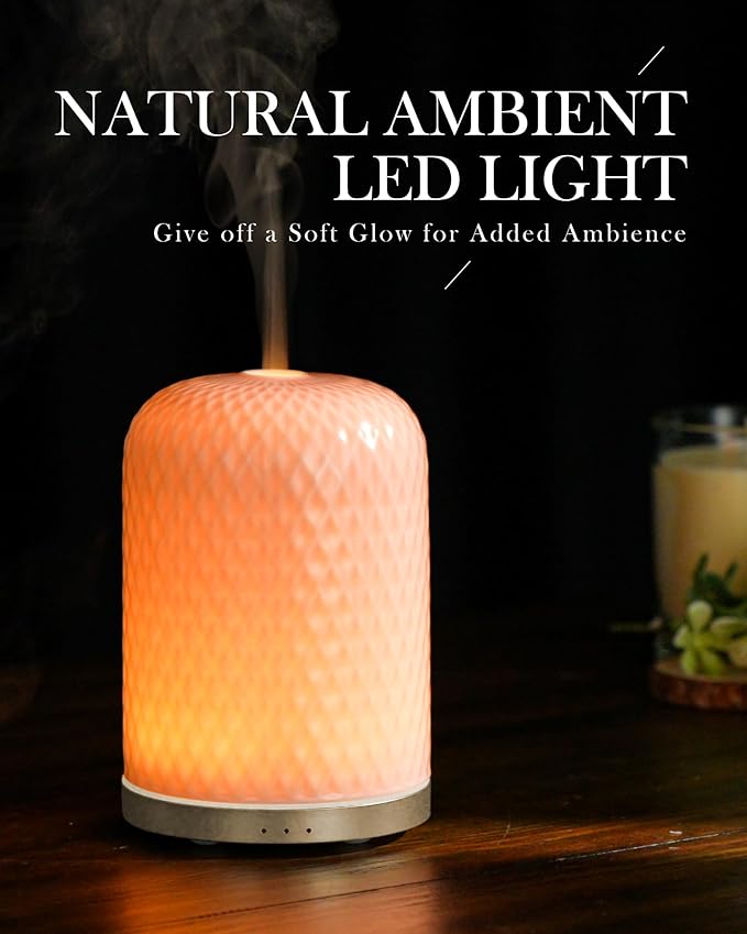 - 【Warm Ambient Light Gives off a Relaxed Atmosphere】 - Compared with other essential oil diffusers on marketing, this ceramic essential oil diffuser adopts warm yellow LED ambient light. Soothing light with even fragrance of aromatherapy diffuser gives off a soft glow for added ambience. Take a break from your busy and enjoy a moment of restful. Relieve stress and promote sleep. Best gift for your loved one on special days-birthday, anniversary days, Valentine's day and Christmas