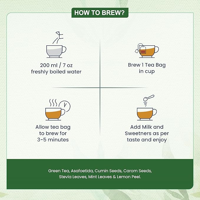 - šµ Natural Ingredients for Pure Taste ā Made from handpicked green tea leaves blended with asafoetida, carom seeds, lemon peel, stevia leaves, and more. Free from preservatives, artificial coloring, and additives for a wholesome, authentic taste.
