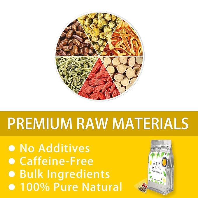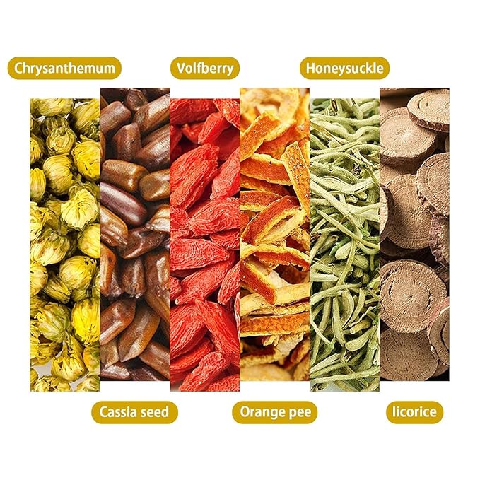 - Holistic Herbal Support: Embrace the power of herbal tea for liver, as Chrysanthemum, Cassia seed, Goji Berry, Orange peel, Honeysuckle meets Licorice to create an exquisite and revitalizing infusion.