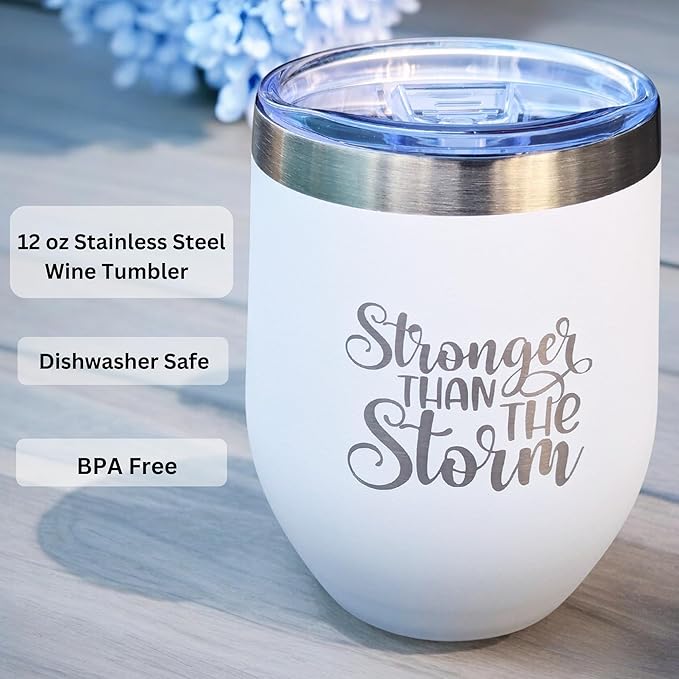 - INSPIRATIONAL 12oz INSULATED TUMBLER – White stainless steel tumbler engraved with “Stronger Than The Storm.” BPA-free, dishwasher-safe, and includes a spill-resistant lid. Ideal for coffee, tea, or wine, reminding her daily of her strength and resilience.