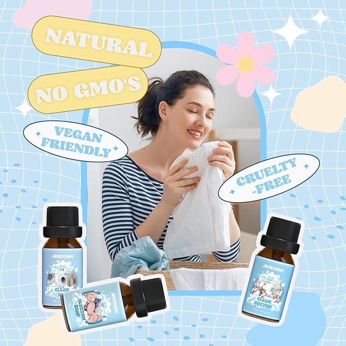 - Crisp, Fresh, Clean Essential Oils Set: ARVIDSSON clean collection features 6 x 10ml premium essential oils, including Clean Cotton, Fresh Linen, Clean Air, Soft Powder, Blossom Soap, Lemongrass. These gorgeous scents can leave your home smelling refreshed and inviting.