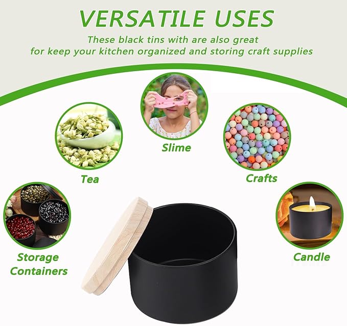 - 【Dimensions & Capacity】:2.58" (Diameter) x 2.05" (Height) black round metal candle tin. Capacity: 4 oz = 118 ml, One pack includes 24 tins 4 oz black tins with wood-grain lids.The black tins are heat-resistant, strong, hard to break, and reusable.
