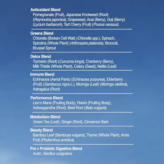 - Full-Body Vitality Support: Packed with Spirulina, Green Tea, Probiotics, and Ashwagandha to help promote a healthy immune system, gut balance, radiant skin, and brain vitality.