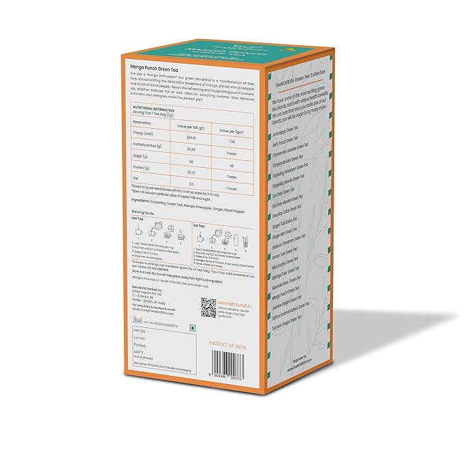 - MANGO PUNCH GREEN TEA: A delightful blend of green tea and mango for a refreshing and fruity fusion, ideal for sipping on a scorching summer day. Enjoy it hot or over ice for a cooling experience.