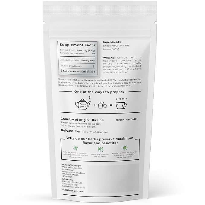 40 Bags Mullen Tea Mullein Tea Leaf (Verbáscum L.) - 40 Count 1.5g Bags Mullen Leaves Mullein Loose Leaf Hoja De Gordolobo