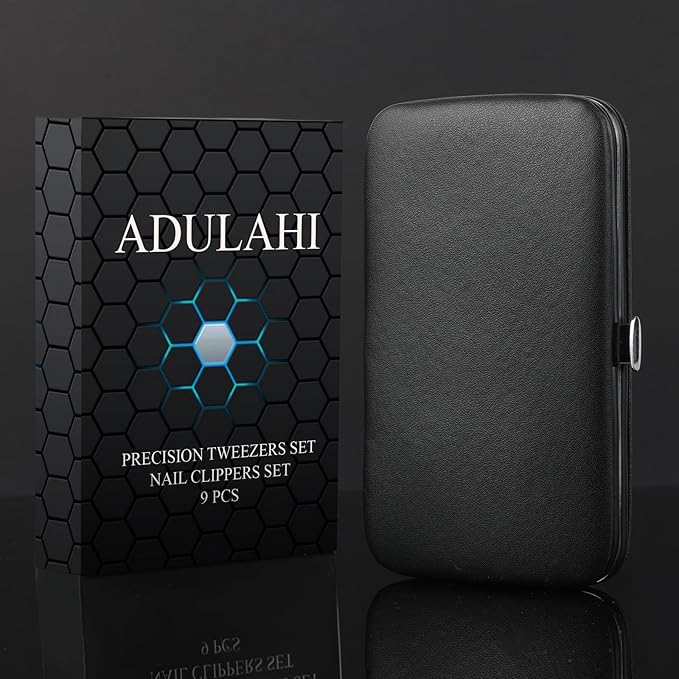 - 【Value Pack Tweezers and Clippers Set】9 PCS Set Including: Fingernail Clipper, Toenail Clipper, Nail File, Flat Tweezers, Pointed Tweezers, Slant Tweezers, Pointed Slant Tweezers, Curved Scissors, Tweezers with Comb and Leater Travel Case.