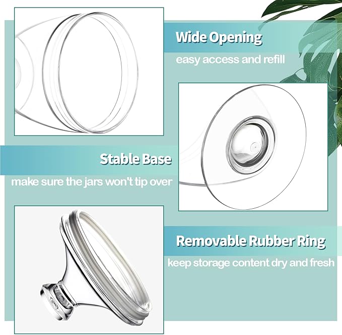 - CONVENIENT & DURABLE: The jar features a wide mouth, which makes them easy to access and refill essentials while the thickness and wide base enhance the durability and stability; The lid comes with a removable rubber ring to keep the storage contents dry and fresh