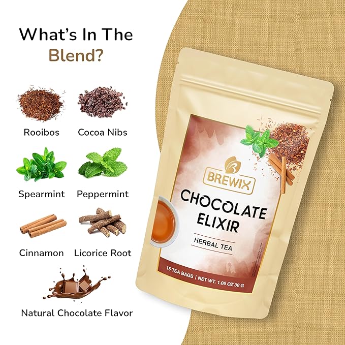BREWIX, Chocolate Rooibos Herbal Tea (15 Pyramid Tea Bags) | Rich Red Tea with Cocoa, Cinnamon & Mint | Naturally Caffeine-Free | Dessert-Inspired Wellness Blend | Soothing Red Tea for Evening Comfort