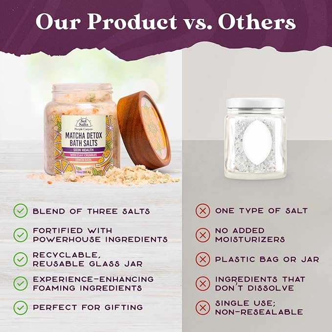 - ๐๐ฅ๐๐๐ง๐ฌ๐ & ๐๐๐ฃ๐ฎ๐ฏ๐๐ง๐๐ญ๐: Immerse yourself in the purifying embrace of Purple Canyon SolSalts Matcha Detox Bath Salts. Our bath soak combines the detoxifying powers of Dead Sea Salt, Epsom Salt, and Pink Himalayan Sea Salt with a premium salt blend, enhanced with Clay Crumbles, ensuring a rejuvenating experience.