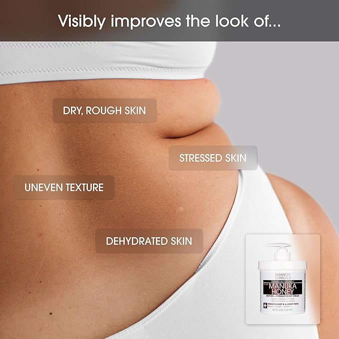 - MANUKA HONEY BODY CREAM NOURISHES & SOFTENS DRY, ROUGH SKIN β This Manuka Honey + Collagen body cream provides hydration to soothe and replenish dry, textured skin. It promotes a softer, more comfortable complexion, leaving skin visibly renewed and nourished. Suitable body cream for women and men. This rich, velvety body moisturizing formula is rich like a body butter, but without a greasy finish. Skin feels smooth and hydrated for a visibly firm look.