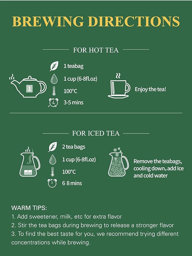 - [100 COUNT ECO-CONSCIOUS TEA BAGS] - Our premium tea bags are made from non-GMO plant fiber, and tea bags are unbleached and compostable. No string and no tag. No extra waste - just healthy & delicious tea!