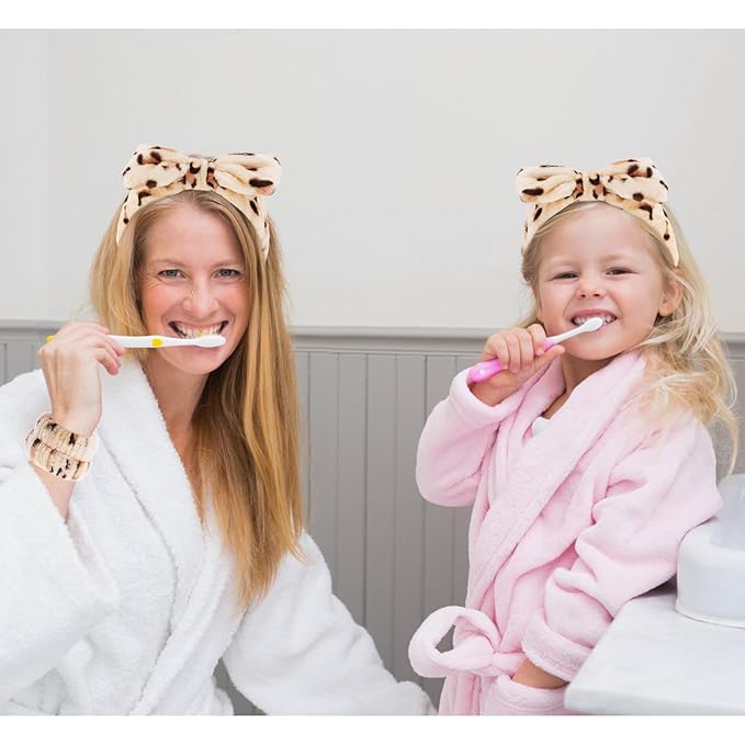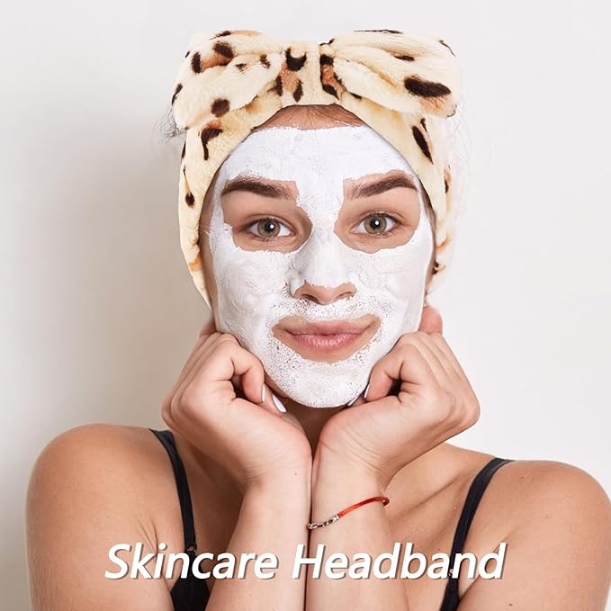 VELSCRUN Spa Headbands for Wash Face, Makeup Headband, Facial Skincare Headbands, 5 Pcs Brown Leopard Puffy Sponge Spa Headband Bow Tie Hair Band Hair Clips Wristband Set Women Girls Accessories