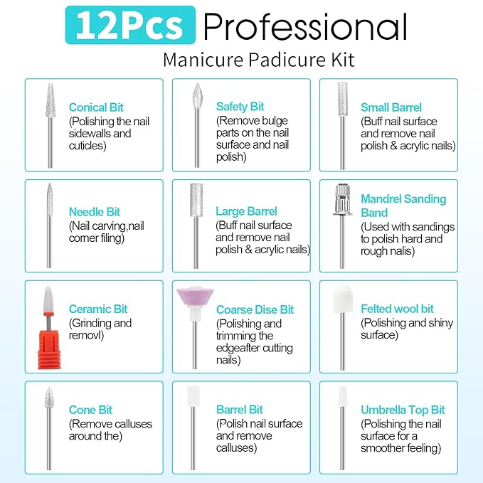 - What you will get: The Electric Nail Drill Kit comes with 12 interchangeable drill bits,100 sanding bands , Type-C charging cable to give your nails a salon-worthy look, this nail kits are the best gift for your nail lovers friends, It's so convenient and you can do a hand or foot care salon privately at home, and everything you need is included.