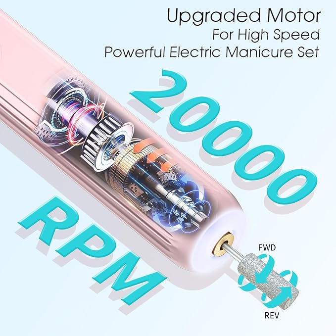 - Easy to use, Even for Beginner: This electric manicure pedicure kit have 3 adjustable speed 0-20,000rpm and designed with forward and reverse rotation directions,choose the appropriate speed and rotation for your needs; ergonomic body design for comfortable holding, speed and direction controlling. Easy to use, enjoy a salon-quality professional manicure pedicure at home. EVEN BEGINNERS CAN USE THIS ELECTRIC NAIL FILE WITH EASE !