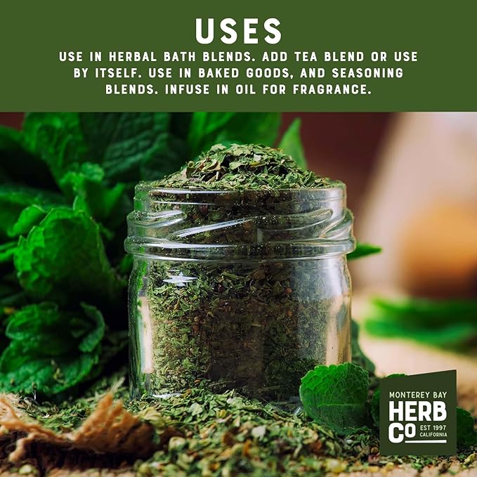 - PREMIUM EGYPTIAN PEPPERMINT – Monterey Bay Herb Co. offers cut & sifted Egyptian peppermint (Mentha × piperita), known for its crisp aroma and cooling properties. Ideal for tea blends, bath soaks, and herbal infusions.