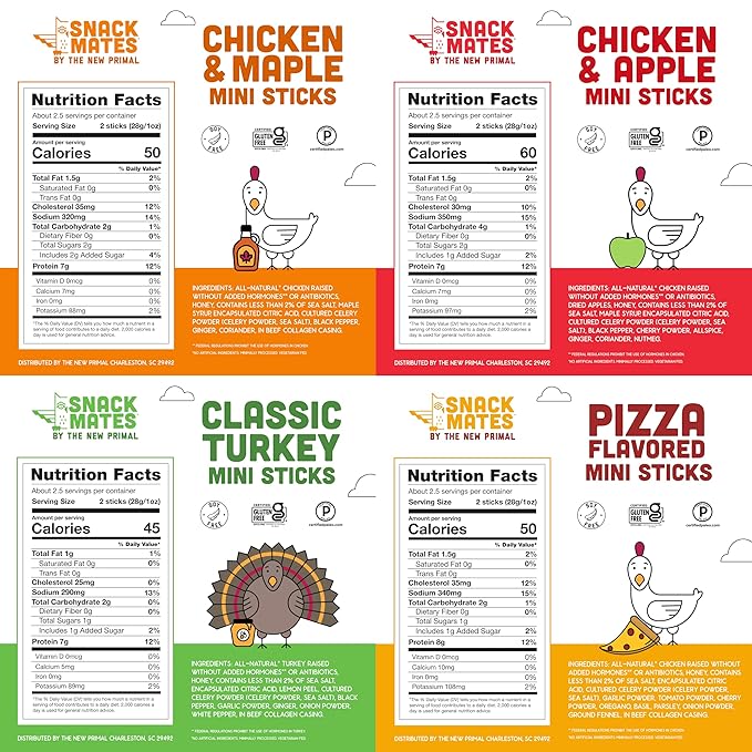 - SAMPLER PACK: 20 kid friendly 0.5 oz. mini sticks: 5 Chicken and Maple, 5 Turkey, 5 Pizza Chicken, 5 Chicken and Apple.