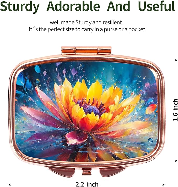 Dynippy Pill Case Pill Box with Mirror Retro Pocket 2 Compartment Medicine Case Vitamin Pill Organizer for Pocket Purse and Travel (Rose Gold - Colorful Flower)