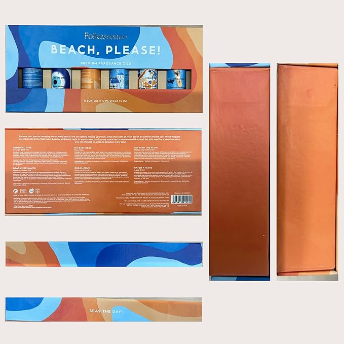 Folkulture Essential Oils for Home | Set of 6 (0.34 fl oz x 6) Beach Diffuser Oil for Relaxation | Coconut Essential Oil for Meditation | Aqua, Oud, Orange Zest Essential Oils for Women