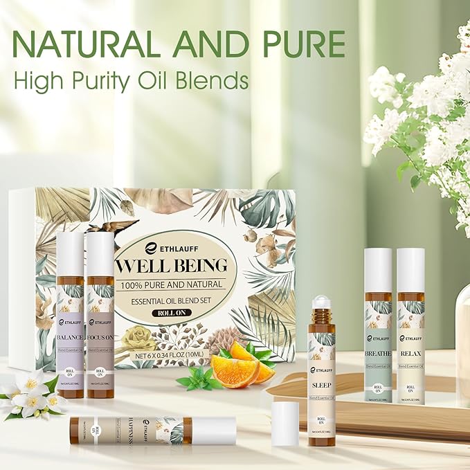 - Self Care Gifts for Women & Men: These essential oil perfume set contains 6 * 10 ml pcs, each oil comes with a glass rollerball, easy to carry.With 6 benefits(Relax, Sleep, Balance,Breathe, Focus on, Happiness), there is always one for you. Perfect for refreshing, stress relief, smooth breathing and more.